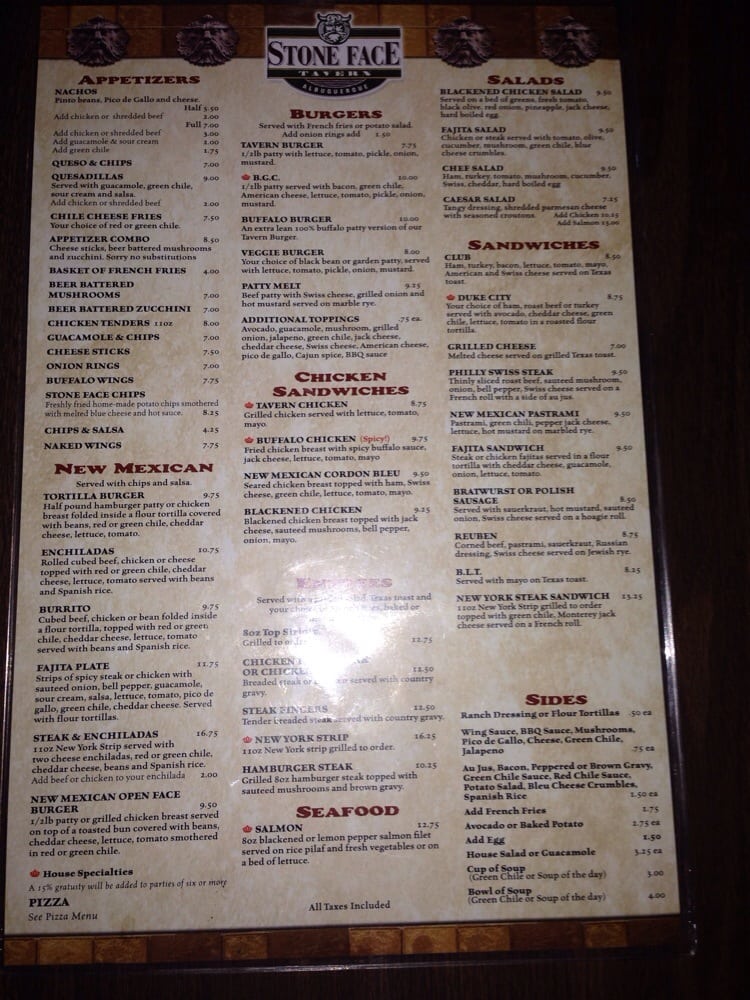 Stone Face Tavern Menu